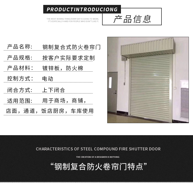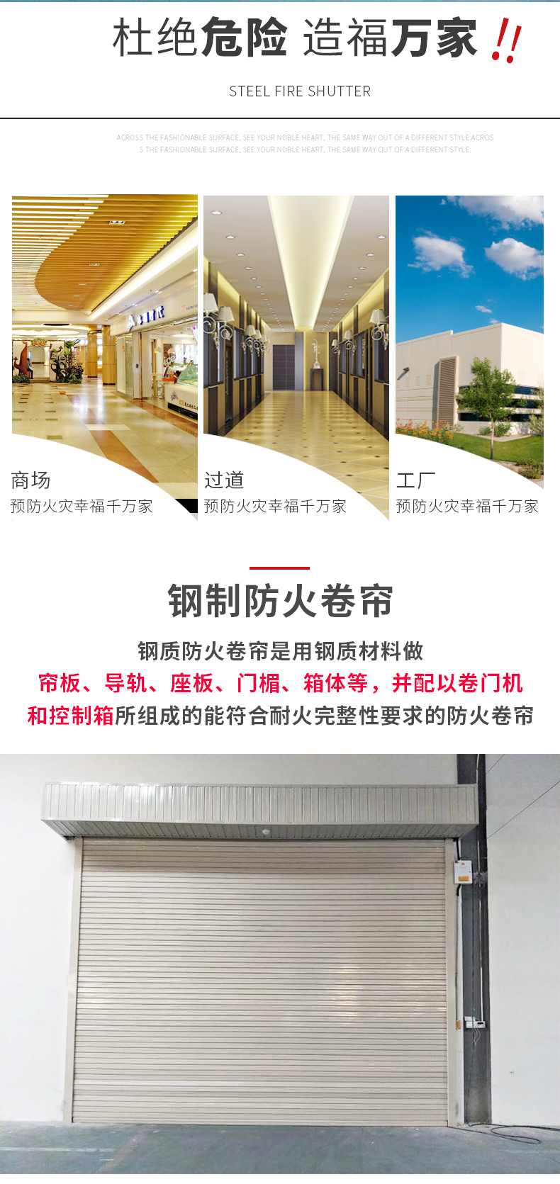 防火卷簾門是一種適用于建筑物較大洞口處的防火、隔熱設(shè)施,產(chǎn)品在設(shè)計(jì)安裝上起到了一定的作用技術(shù)。防火卷簾門廣泛應(yīng)用于工業(yè)與民用建筑的防火隔斷區(qū),能有效地阻止火勢蔓延,保障生命財(cái)產(chǎn)安全,是現(xiàn)代建筑中不可或缺的防火設(shè)施。